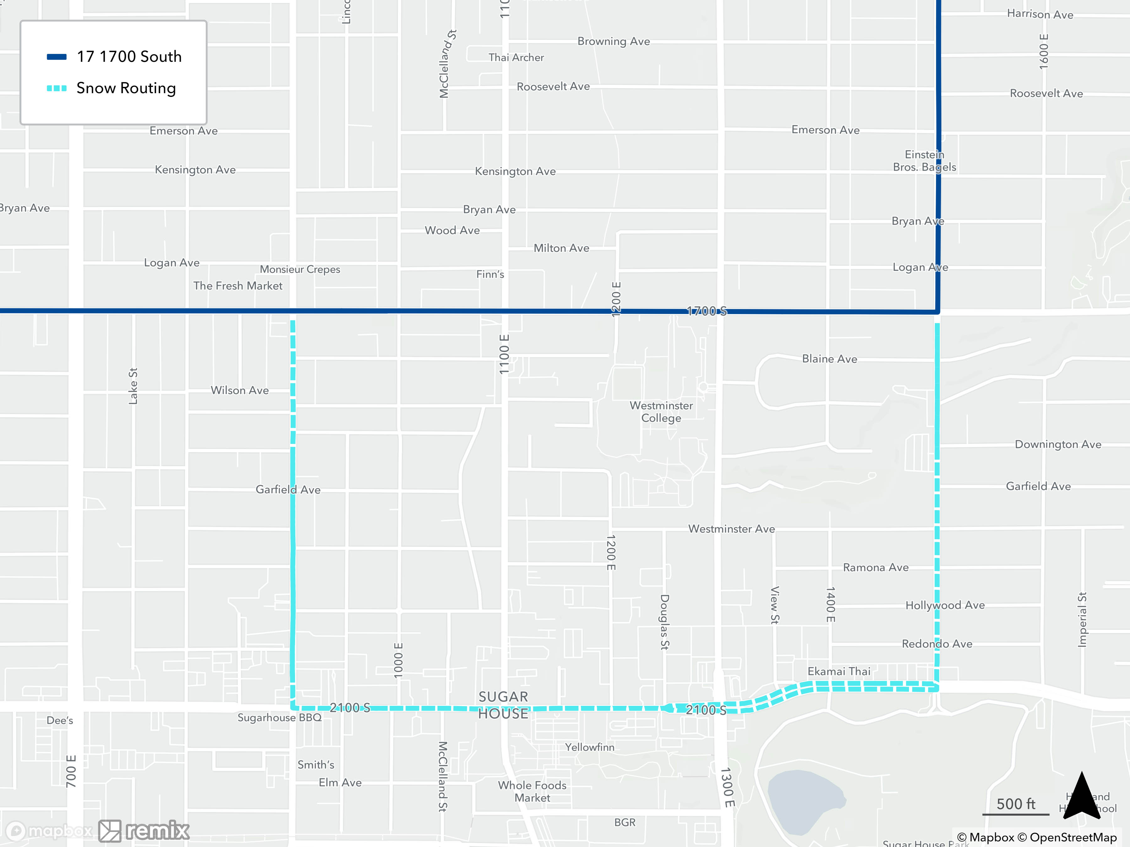 When a bus is on snow routing, it will detour from its regular route. You may need to catch your bus at a different location during this time. See below to find your route’s specific snow routing map to determine where to catch the bus. If you need assistance, please call 801-743-3882 or contact us on Twitter at @RideUTA or sign up to receive route-specific notifications.